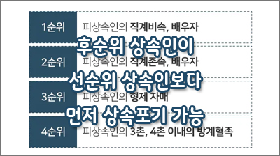 Á¦3Á¶ (ÈļøÀ§ »ó¼ÓÀÎÀÇ »ó¼ÓÆ÷±â½Å°í) ÇÇ»ó¼ÓÀÎÀÇ »ó¼ÓÀÎÀÌ µÉ ÀÚ°ÝÀÌ ÀÖ´Â »ç¶÷(¹è¿ìÀÚ, Á÷°èºñ¼Ó, Á÷°èÁ¸¼Ó, ÇüÁ¦ÀÚ¸Å, 4ÃÌ À̳» ¹æ°èÇ÷Á·)Àº »ó¼ÓÀÌ °³½ÃµÈ ÀÌÈÄ¿¡´Â ¼±¼øÀ§ »ó¼ÓÀÎÀÌ »ó¼ÓÆ÷±â½Å°í¸¦ ÇÏÁö ¾Æ´ÏÇÑ °æ¿ì¶óµµ ¼±¼øÀ§ »ó¼ÓÀκ¸´Ù ¸ÕÀú ¶Ç´Â ¼±¼øÀ§ »ó¼ÓÀΰú µ¿½Ã¿¡ »ó¼ÓÆ÷±âÀÇ ½Å°í¸¦ ÇÒ ¼ö ÀÖ´Ù.
